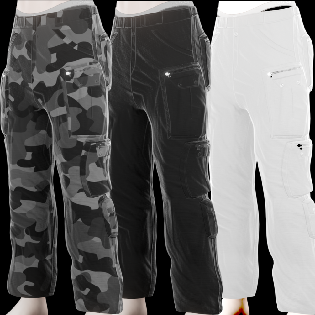 "Please note that the Cargo Pants are not rigged due to the sheer diversity of Male bases. We believe that providing a pre-made rig for this item could hinder the creator's process. As a result, basic knowledge of Blender and weights is required. Make sure Remove the zips for lower poly. However, we're pleased to inform you that the Cargo Pants have been easily adapted to two different bases using standard data transfer with nearest face interpolation and minor blur."